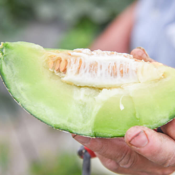 網目が細かくネットの盛り上がりが浅いのが特徴。果肉は緑色で糖度が15 度前後と高くさわやかな甘味があります。