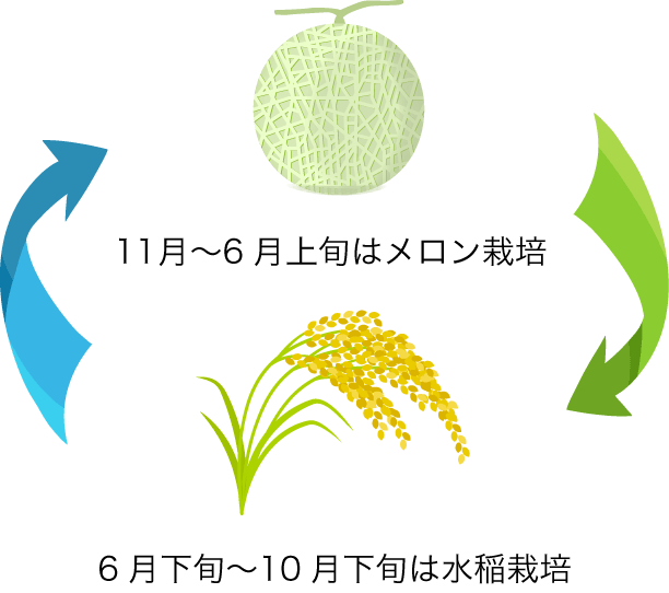 メロンと水稲を輪作することで、肥料のメタボが改善され、土壌のバランスが良くなり双方とも良質なものが収穫できるようになりました。